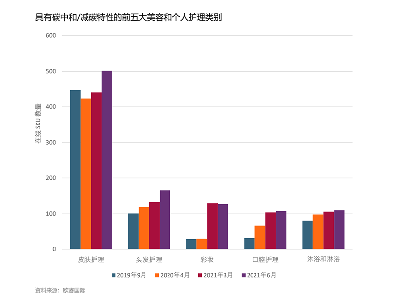 在美容个护领域,《趋势》对2019年9月、2020年4月、2021年3月、2021年6月这四个时间节点中,具有碳中和/减碳特性的前五大美容个护类别的在线SKU数量进行统计,发现在皮肤护理、头发护理、彩妆、口腔护理、沐浴和淋浴这五大类别中,除了彩妆在线SKU数量在2021年6月比2021年3月稍有下降,其他品类在线SKU均逐渐增多。其中,皮肤护理在线SKU数量最多,2021年6月这一数据已达500个。
